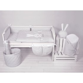 Roztomilá kolekcia s krásnym zajačikom, ktorý bude kontrolovať všetky bábätká pri ich spánku. Deti si toto obliečky zamilujú, odstávajúce mäkučké uši budú ich obľúbenou hračkou v postieľke. Mäkučký, šedý nos ozdobí jemné farby obliečok. Mašličky v polovici obliečky nie sú len jemnú dekoráciu, ale aj praktické. Výplň sa vkladá uprostred, zabraňuje tak vypadávaniu perinky.
