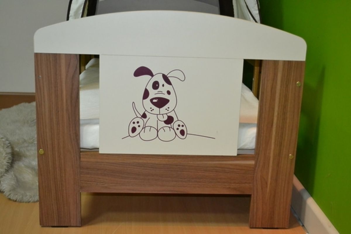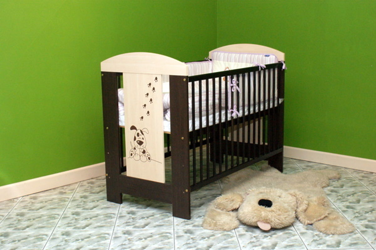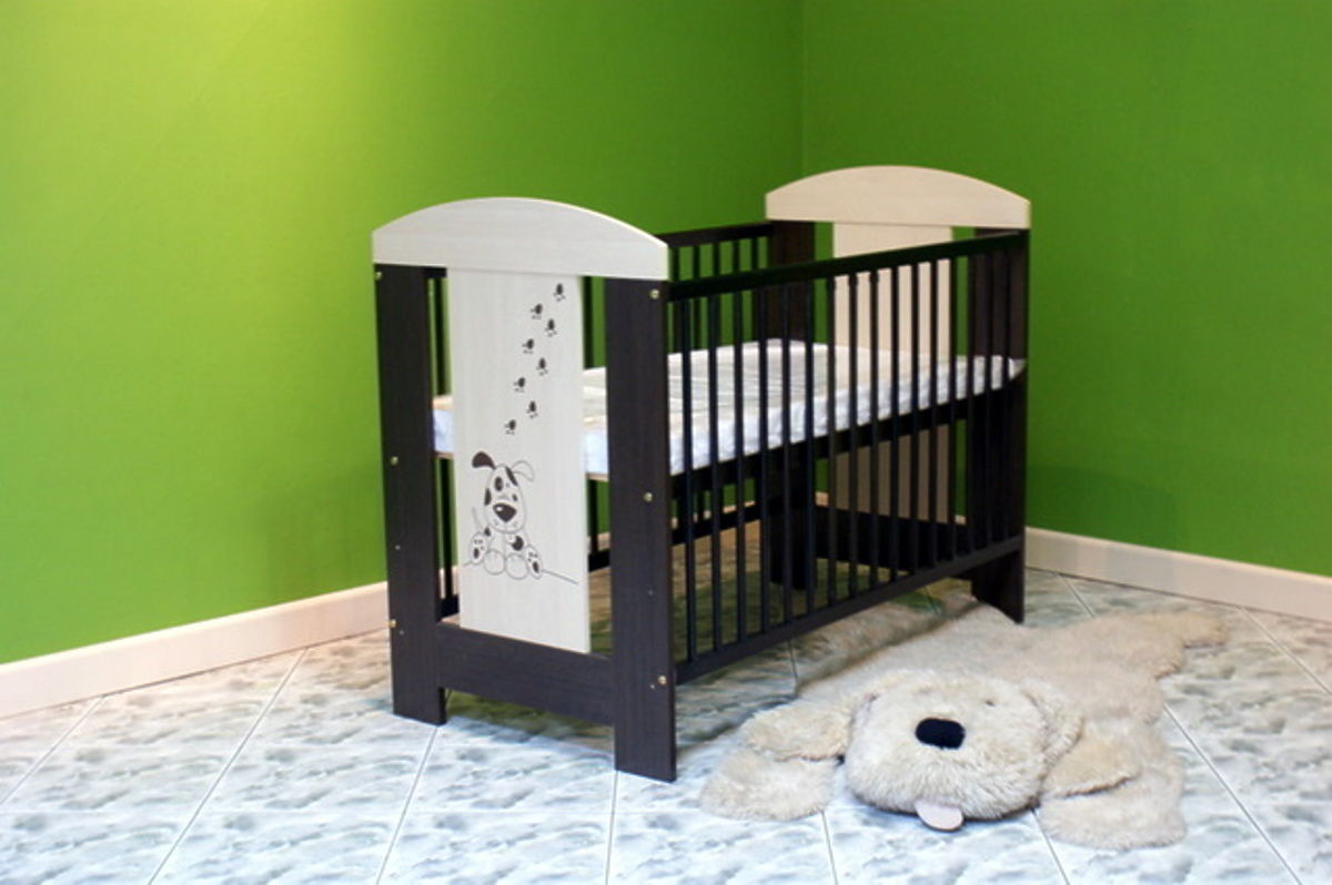 Detská postieľka Psík vo farebnej kombinácii wenge - vanilka. Vonkajšie rozmery detské postieľky 1240 x 650 x 960mm. Rošt postieľky je možné nastaviť do 3 polôh, vyberateľné 3 kusy výplňových stĺpikov.
