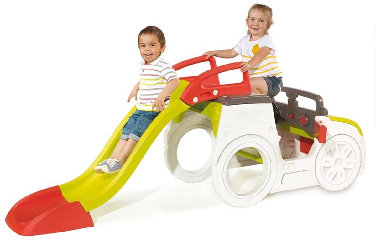 Kombinácia autá s elektronickým klaksónom, šmykľavky, preliezky a pieskoviska. Pod odklápacie kapotou priestor pre piesok. Kôš na piesok je vyberateľný pre lepšiu údržbu. Piesok nie je súčasťou! Dvierka sú otváracie. Ku šmykľavke je možné pripojiť hadicu s vodou a vlhčiť tak sklznú plochu pre jednoduchšie a zábavnejšie kĺzanie.