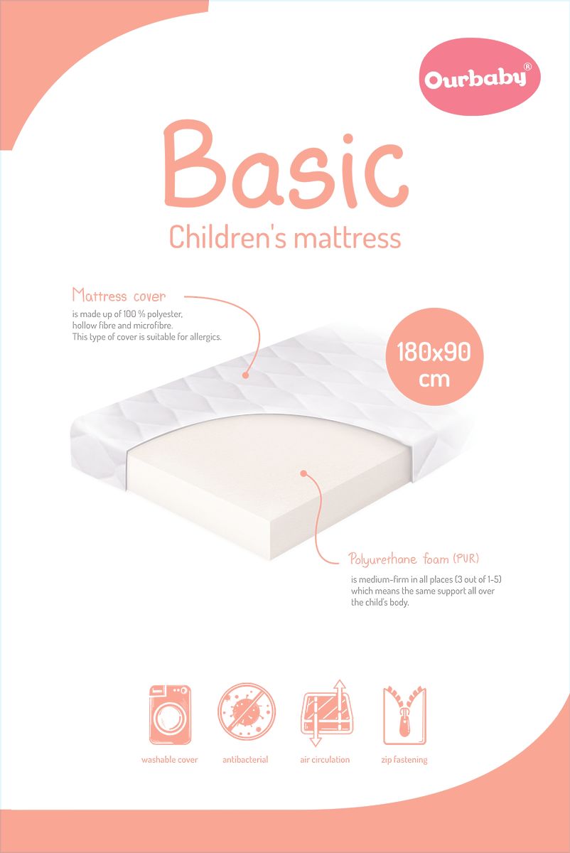 Rad BASIC - Základný rad matracov našej značky Ourbaby® , pod ktorým produkujeme nielen matrace. Penové matrace BASIC ponúkame v rozmeroch pre deti každého veku. PUR pena matraca je stredne tuhá. Detské matrace BASIC sú najlepšou voľbou pokiaľ zháňate kvalitný matrac za prijateľnú cenu.