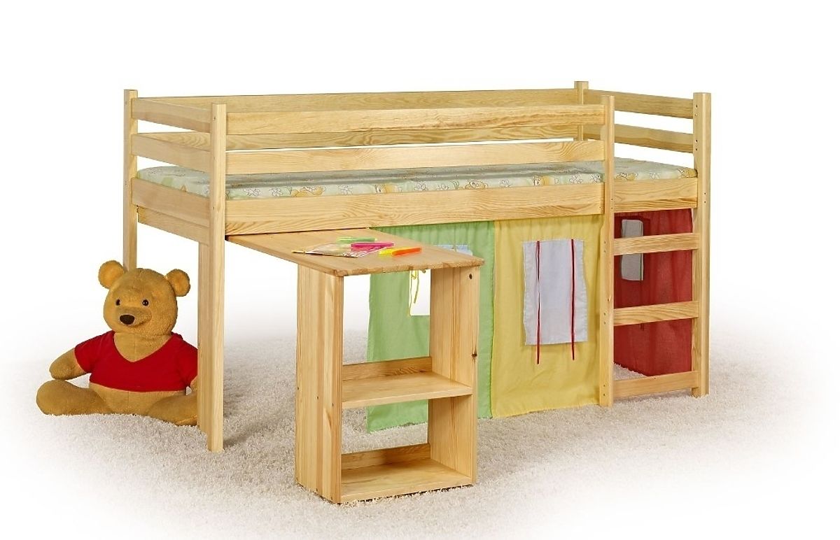 Detská vyvýšená posteľ s písacím stolom. Posteľ je vyrobená z borovice. Postele dodávame vrátane roštu a matraca.