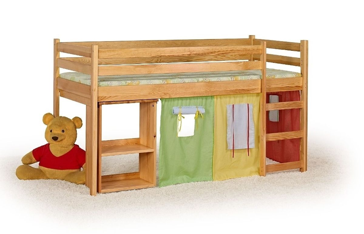 Táto detská posteľ svojou konštrukciou ponúka kombináciu pohodlného a bezpečného spánku na vyvýšenej posteli a priestoru na hranie v domčeku s látkovou stenou. Novinkou je aj detský písací stôl, ktorý ide vysunúť a zasunúť späť pod posteľ. Nápaditým riešením prevedenia detskej postele,tak poskytuje veľmi účelné využitie priestorov v detskej izbe. Výberom farby masívu (borovica alebo jelša) ,tak možno vytvoriť krásne farebné ladenie v detskej izbe.