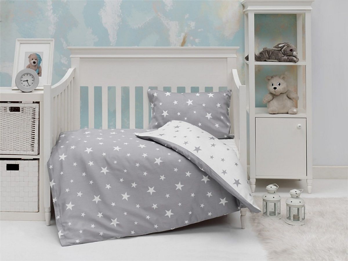 Drobnými hviezdičkami posiate detské obliečky hviezdičky prinesie krásne sny aj tým najmenším. Decentná kombinácia šedej a čisto bielej farby bude ozdobou každej detskej izbičky. Vrchná strana prikrývky a vankúše zodpovedá prevedení šedý podklad a biele hviezdičky, spodná strana je vykonaná inverzne.