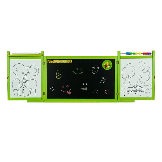 Detská obojstranná, otvárací tabuľa na stenu. Je vyrobená z dreva v zelenej farbe. Tabuľa je z jednej strany magnetická a z druhej strany kriedová.