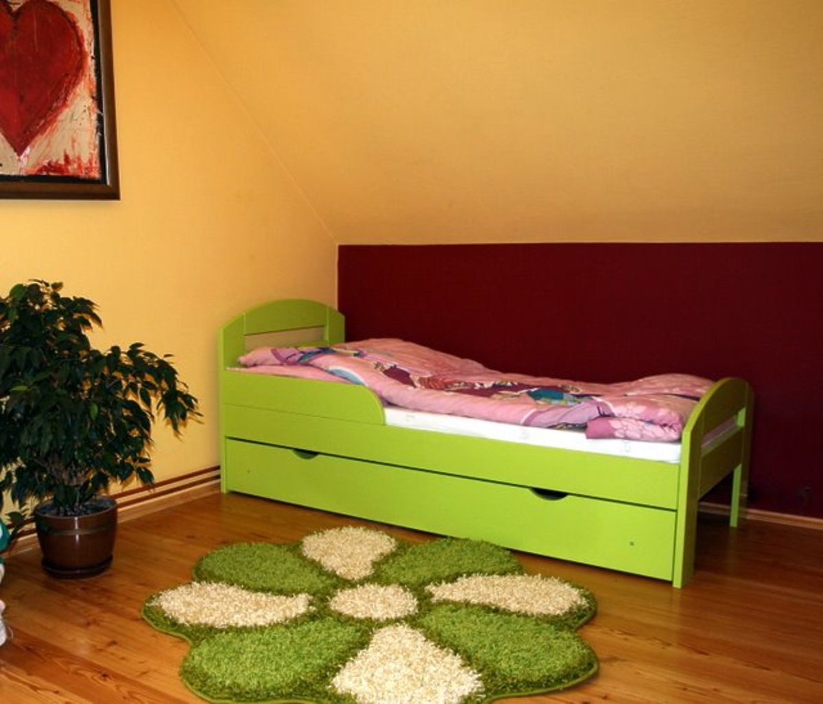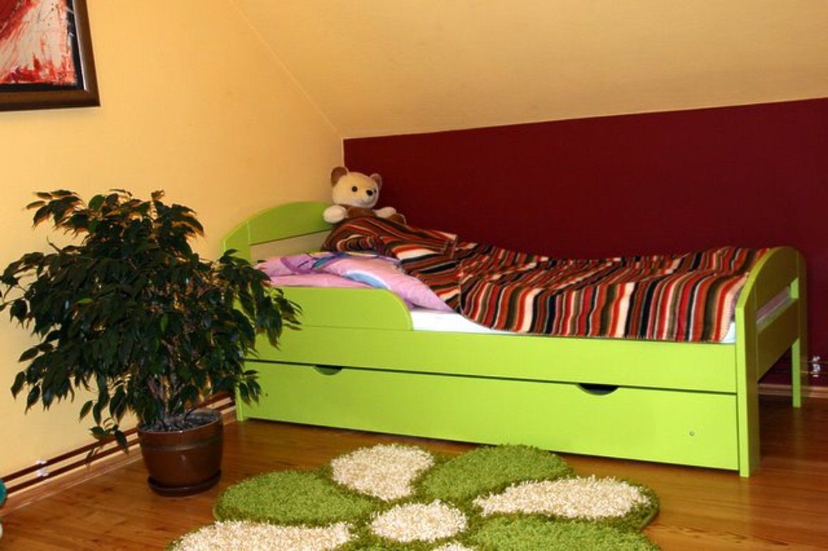 Posteľ bola iba zložená a nesie stopy po montáži. Detská posteľ TIMI Detská posteľ TIMI s úložným priestorom - je vyrobená z kvalitného borovicového dreva vo farbe zelená. Každá hrana pri posteli je zaoblená pre bezpečnosť detí. Posteľ sa vyrába v prevedení, zelená. Posteľ má certifikát FSC Každá posteľ je 3x morená a lakovaná atestovanými farbami. Posteľ obsahuje: Rám postele, rošt pod matrac, inštrukcie, úložný priestor, komplet skrutiek pre montáž postele. Posteľ je vyrobená z lepeného borovicového dreva bez hrčí. Drevo je prírodný materiál, ktorý nás sprevádzal po tisíce rokov. Je odolné, príjemné na dotyk, starnutie dreva dodáva tomuto materiálu väčšiu cenu a krásu a neuvoľňuje zdraviu škodlivé látky počas používania. Žiadny materiál z laminátovej dosky, mdf, atd nemôže nahradiť prírodný masívny drevený výrobok. Výrobky z masívneho lepeného dreva sa osvedčili časom ako veľmi kvalitný materiál. Pri tomto dreva sa veľmi starostlivo vyberajú len tie najlepšie kusy a tímpádem tieto dosky neobsahujú hrče, ktoré v prirodzenom prevedení tento materiál obsahuje. Preto sa tiež predchádza komplikáciám ako prasknutie v suku, alebo nevzhľadné a nerovné štruktúre. Masívne liate drevo je synonymom pre vysokú kvalitu, pevnosť a trvanlivosť. Tieto drevené postele majú veľmi stabilnú konštrukciu a zaisťujú dlhoročné bezpečné používanie bez známok opotrebovania. Starostlivé vyhladenie povrchu spôsobuje prirodzenú hru farieb a vytvára unikátny estetický vzhľad. Matrac nie je súčasťou postele, nájdete ju v ľavom menu sekcia matraca. Nosnosť postele je 80kg.