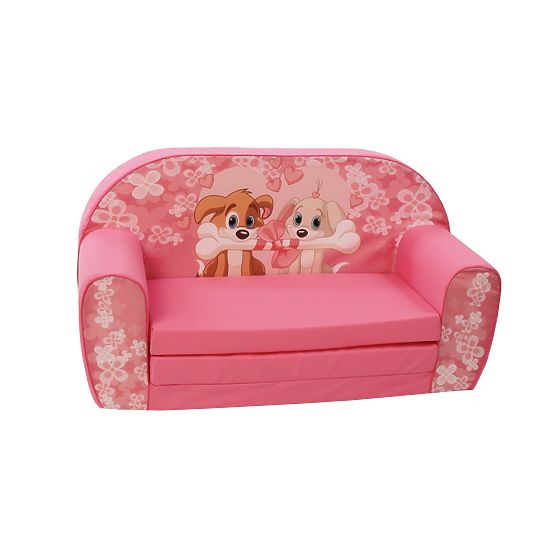 Krásna ružová pohovka s roztomilými psíkmi je ľahká, takže ju aj dieťa môže jednoducho premiestniť, rozložiť či zložiť.
