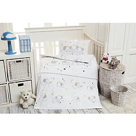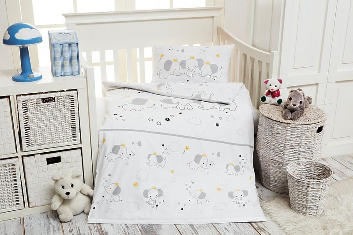 Čisté a nežne hravé obliečky BIMBO sú ideálnou variantou do chlapčenskej i dievčenskej postieľky. Kombinácia prírodného bieleho podkladu a čiernobielych sloníkov so zlatými korunkami a hviezdičkami všade okolo prinesie potešenie nielen tým najmenším.