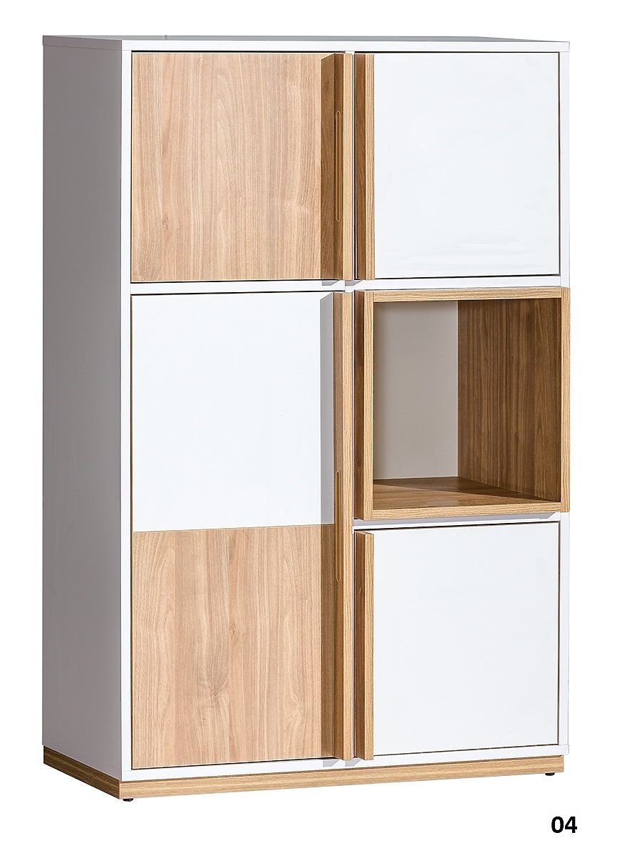 Komoda do detskej, študentskej alebo obývacej izby v modernej farebnej kombinácii odtieňov bielej a orechu select.