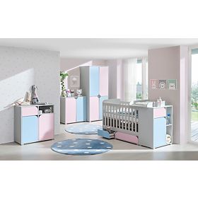 Priestranná kombinovaná komoda z kolekcie nábytku pre bábätko Mimo vo svetlých farbách (šedá, modrá a ružová) zabezpečí, že detská izba bude vždy uprataná a všetko potrebné k starostlivosti o bábätko budete mať po ruke.