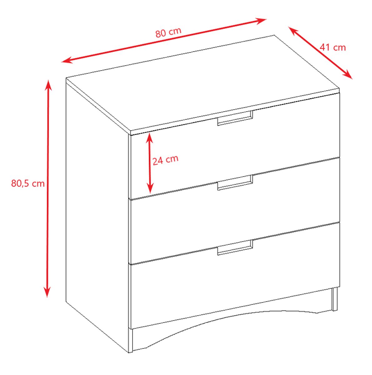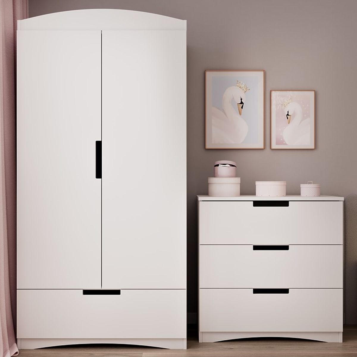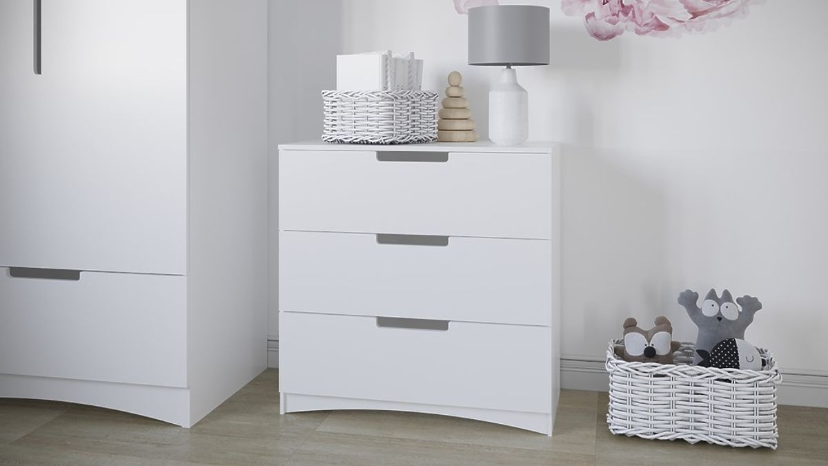 Biela priestranná komoda do detskej izby zaujme svojou jednoduchosťou so zaujímavými prvkami ako sú otvory na prsty v zásuvkách a oblúk v spodnej a hornej časti komody.