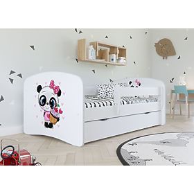 Detská posteľ s polepom kreslené Pandy na bielom pozadí. Čiernobiela panda má veľké roztomilé oči a sladký dortíků v labke. Nechýba ani množstvo srdiečok, čo z tejto postele robí vhodný kus detského nábytku do izby pre dievčatá.