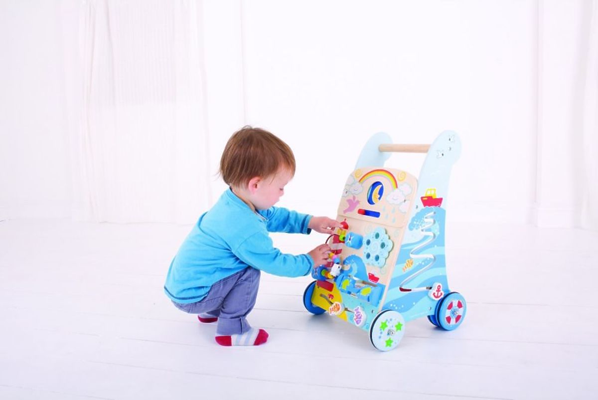 Farebné tlačiace chodítko s hernými prvkami pomáha dieťaťu spoznávať okolitý svet a zároveň rozvíja jeho pohybové schopnosti. Chodítko uľahčuje deťom prvé krôčiky a vďaka gumovým kolesám a brzdám umožňuje bezpečný a kontrolovaný pohyb. Keď sa batoľa unaví chôdzu, môže sa začať hrať. Na každej zo stien dreveného chodítka nájdete niečo iné: