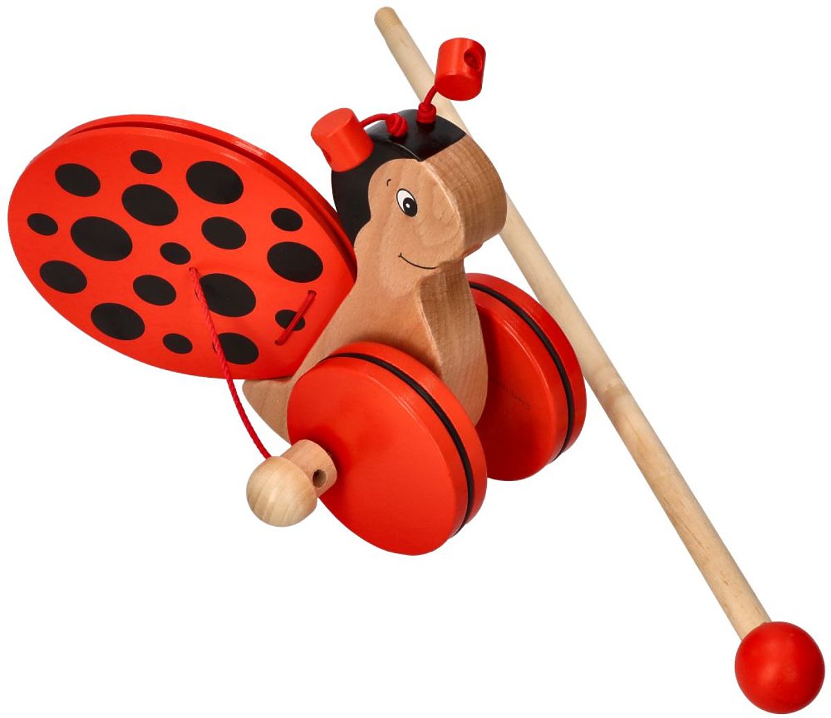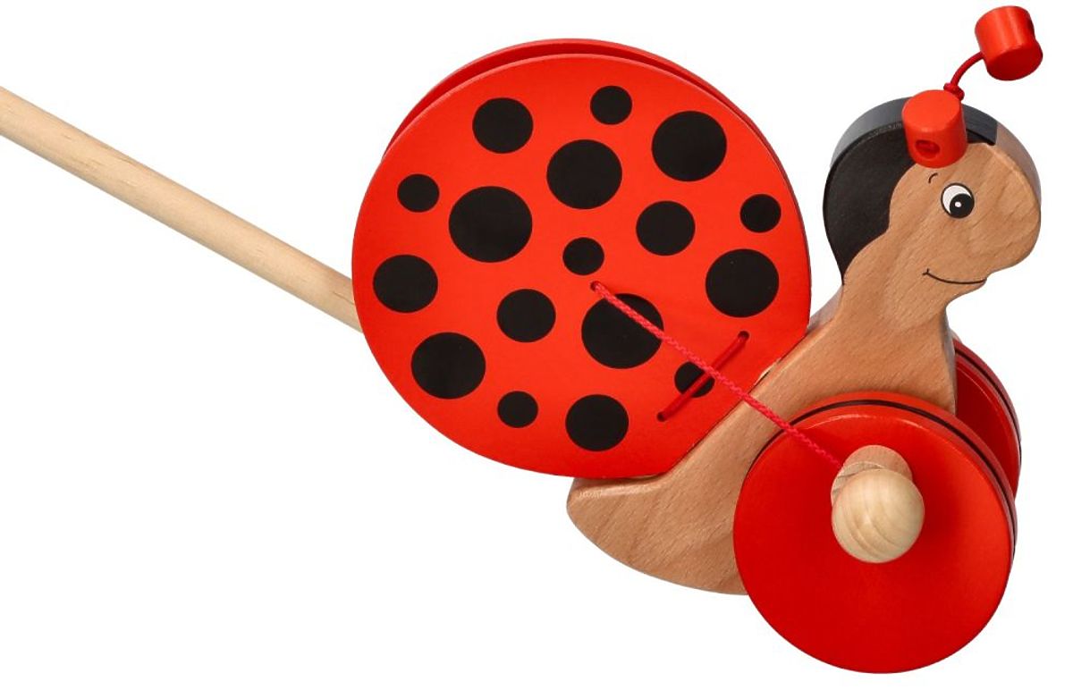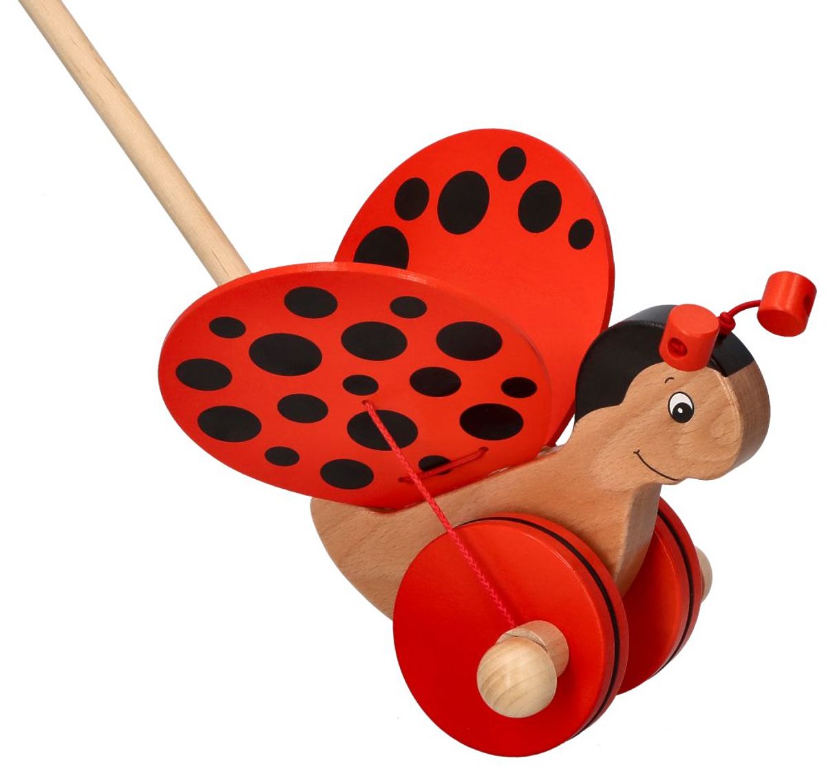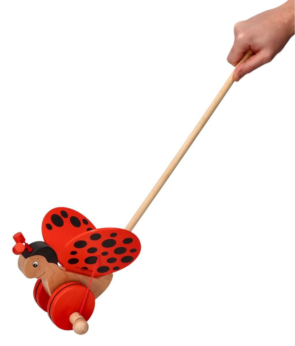 Hračka pomáha dieťaťu stavať prvé krôčiky a nabáda ho k chôdzi. Vďaka drevenej tyči môže batoľa malého kamaráta tlačiť pred sebou a sledovať ako veselo pohybuje krídlami. Pozornosť dieťaťa pritiahne červená farba s kontrastnými čiernymi bodkami.