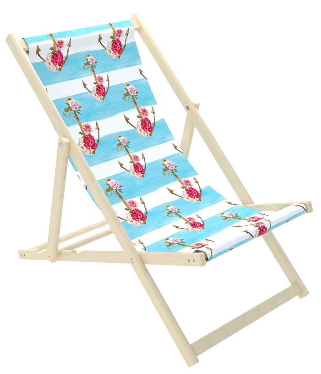 Krásne plážové ležadlo so vzorom lodných kotiev s kvetmi ruží. Kotvy sú rozmiestnené na vodorovných modro-bielych prúžkoch. Ležadlo je vhodné na mori i na záhradu. Plážové ležadlo pre dospelých je skvelou alternatívou záhradné stoličky či kresielka.