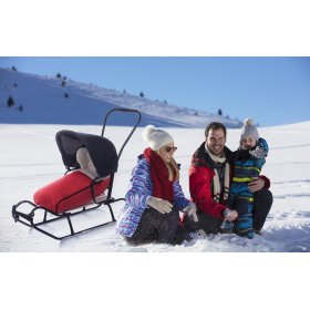 S týmito sánkami, si môžete užiť snehové radovánky aj tam, kde sa s klasickým kočíkom nedostanete. Súčasťou je zateplený fusak červenej farby , ktorý vaše dieťa udrží v teple a suchu za akéhokoľvek počasia.