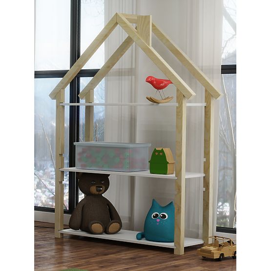 Bielo-prírodný policový regál FRANK v tvare domčeka je štýlovým a praktickým doplnkom do detskej izby. Poteší dievčatá aj chlapcov. Tri police v rôznych výškach deťom poskytnú dostatok priestoru na organizáciu ich osobných vecí. Od hračiek cez školské učebnice až po všelijaké drobnosti.