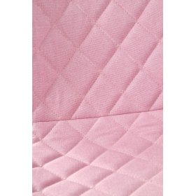 Stolička je z vnútornej strany čalúnená prešívanou čalounickou látkou az vonkajšej strany kvalitnou ekokožou. Celok je vyrobený v jemnej svetlo ružovej farbe. Pohodlné sedenie zaručuje päť mäkkých plastových koliesok a jedinečný tvar operadla. Výšku sedenia je možné polohovať v rozmedzí 9 cm.