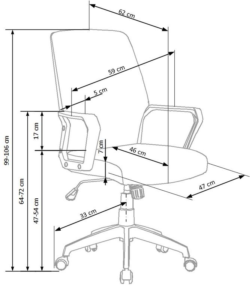 Stolička má pevnú konštrukciu z bieleho tvrdeného polypropylénu a je čalúnená priedušnou čalounickou látkou. Disponuje mechanizmom TILT, vďaka ktorému ľahko nastavíte výšku sedenia pomocou plynového zdviháka. Pohodlné sedenie zaručujú praktické podrúčky a päť plastových koliesok.