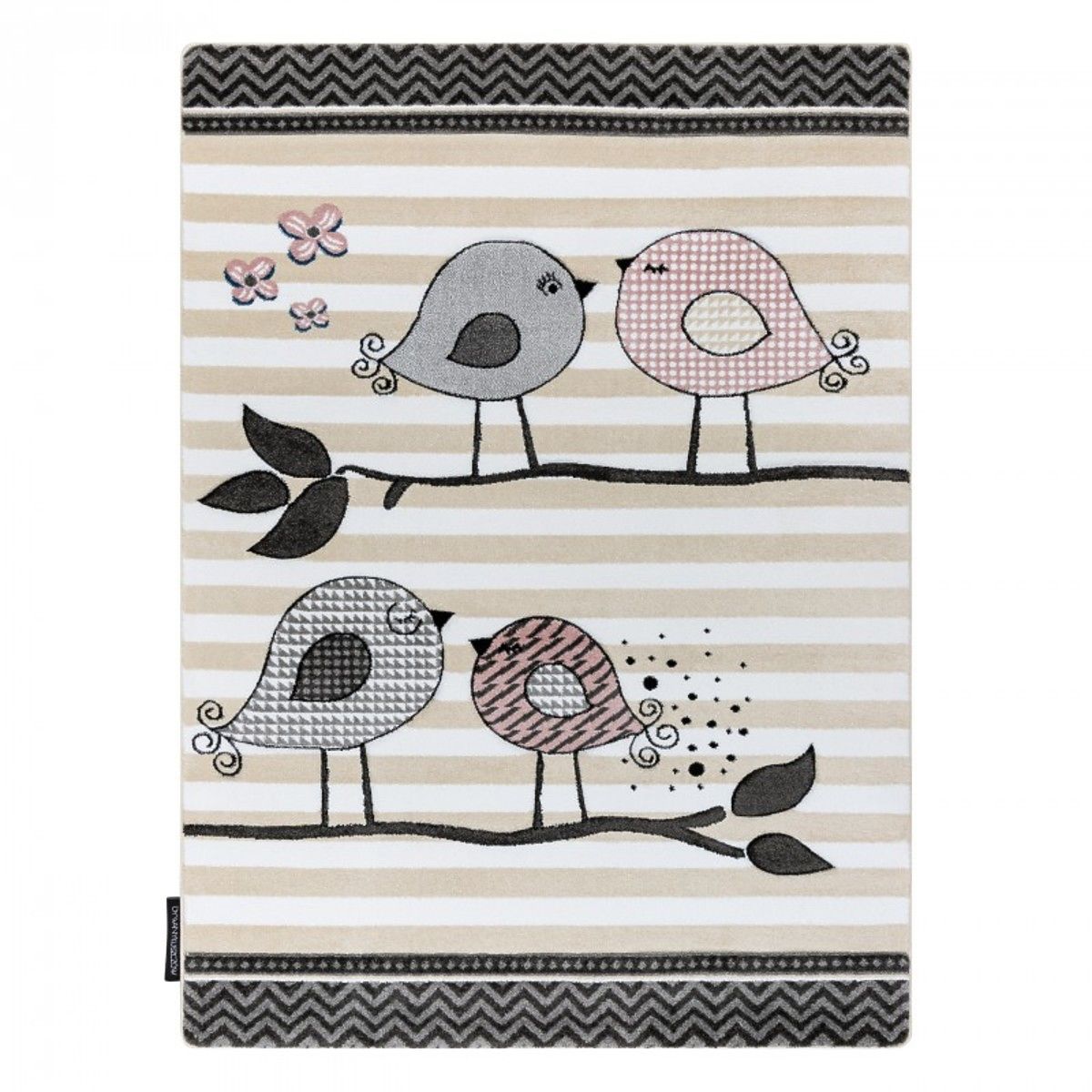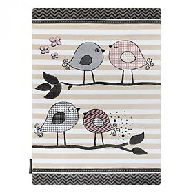 Pruhovaný, béžovo-biely koberec, z kolekcie Petit, s motívom roztomilých vtáčikov krásne doplní každý dievčenské izbičku. Koberec je mäkučký, príjemný na dotyk a vďaka nízkemu vlasu ľahký na údržbu.