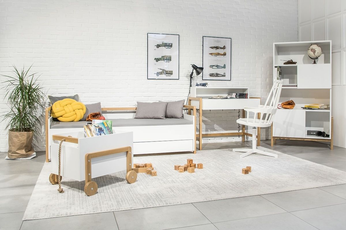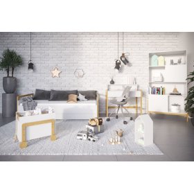 Detská posteľ s operadlom Viktor v škandinávskom štýle dodá šmrnc každej izbičke. Biela posteľ s drevenými prvkami s rozmermi 180 x 80 cm v noci poslúži ako klasické lôžko a cez deň ako pohovka pre návštevy alebo útulný kútik na hranie.