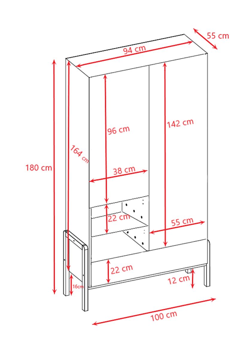 Vnútorný priestor skrine tvorí priestranný oddiel so šatníkovou tyčou a päť políc, z toho dve sú otvorené a ponúkajú tak pohodlný prístup k predmetom dennej potreby. V spodnej časti skrine je praktická, uzatvárateľná zásuvka.