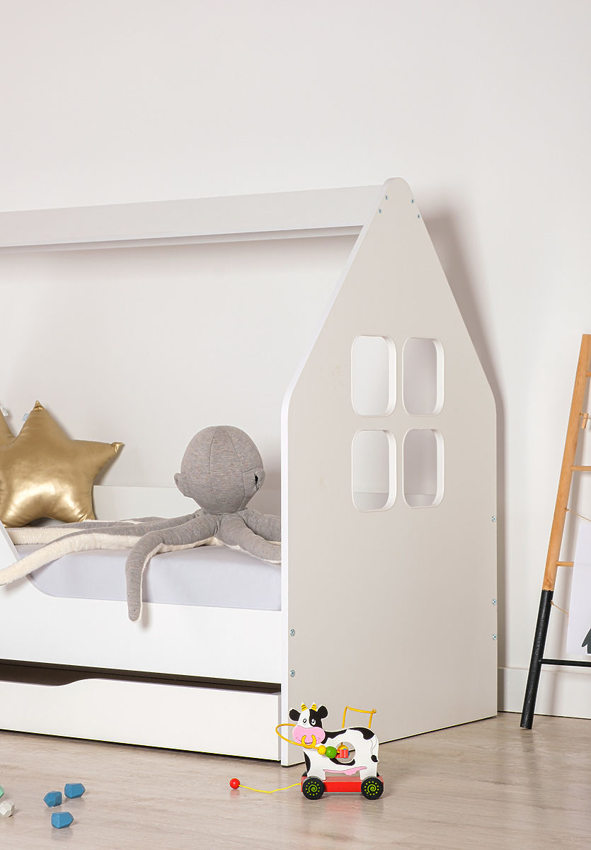 Biela posteľ Woody v tvare domčeka s oknami o rozmere 160 x 80 cm. Toto originálne prevedenie domčekovej postele sa stane krásnou dominantou detskej izby. Počas dňa splní funkciu útulného kútika a v noci vytvorí bezpečné miesto na spanie.