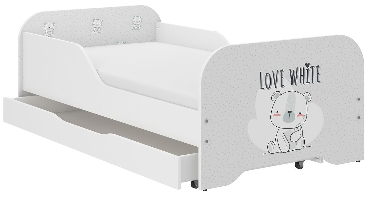 Detská posteľ Miki s bezpečnostnou zábranou s potlačou roztomilého bieleho medvedíka s rozmermi 160 x 80 cm. Súčasťou postele sú dve postranné zábrany a posteľový rošt.