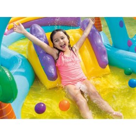 Nafukovacie ihrisko INTEX sa skladá z bazéna, šmykľavky a ďalšieho vybavenia, ako sú palmy alebo nafukovací dinosaurus. Súčasťou sady sú aj loptičky, s ktorými môže batoľa plávať alebo hádzať do košíka.