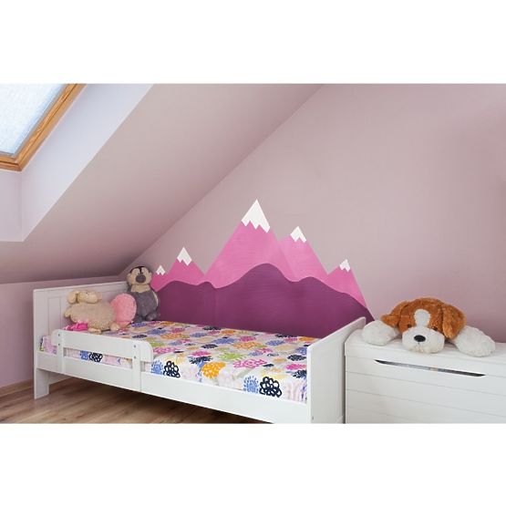 Penová ochrana steny za posteľ v podobe ružových vrcholkov hôr zútulní spací priestor a poskytne deťom pohodlný a bezpečný spánok. Mäkká pena izoluje pred chladom od studeného múru a navyše chráni stenu pred nechceným poškodením.