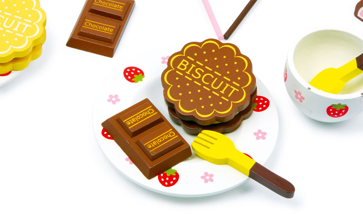V tomto priestrannom nádherne maľovanom drevenom boxe s vekom nájdu deti bohatý výber lahôdok! Potraviny sú spojené suchým zipsom a deti ich môžu krájať dreveným nožom.
