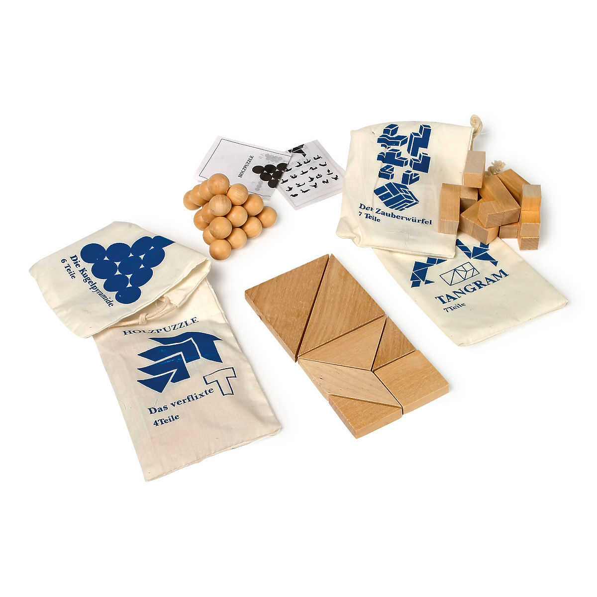 Sada 4 hlavolamov z masívneho dreva rozvíja logické a priestorové myslenie. Hry je možné uložiť do látkovej tašky so sťahovacou šnúrkou. Hlavné vlastnosti: .. viac