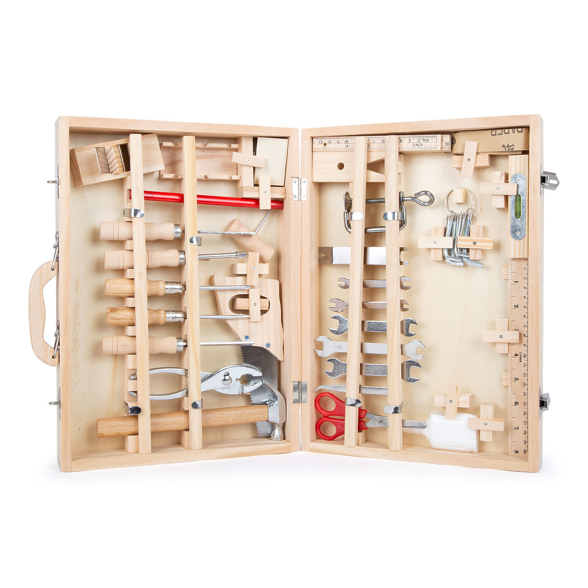 Kufrík Deluxe je komplexná sada náradia: Závesná drevená krabica so 48 dielmi pre malých domácich majstrov! V kufríku Deluxe nájdete všetko potrebné drevené aj kovové náradie pre všetky druhy prác a opráv. Nájdete v ňom kľúče, skrutkovače, pílu, nožnice, dláto, tesársku ceruzku, šesťhranný kľúč, kladivo a ďalšie! Každá položka má svoje miesto v kufri, všetky diely sú vybavené poistkami, ktoré ich na svojom mieste držia. Hlavné vlastnosti: Komplexná sada obsahuje 48 dielov Praktický drevený kufor na uloženie