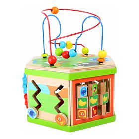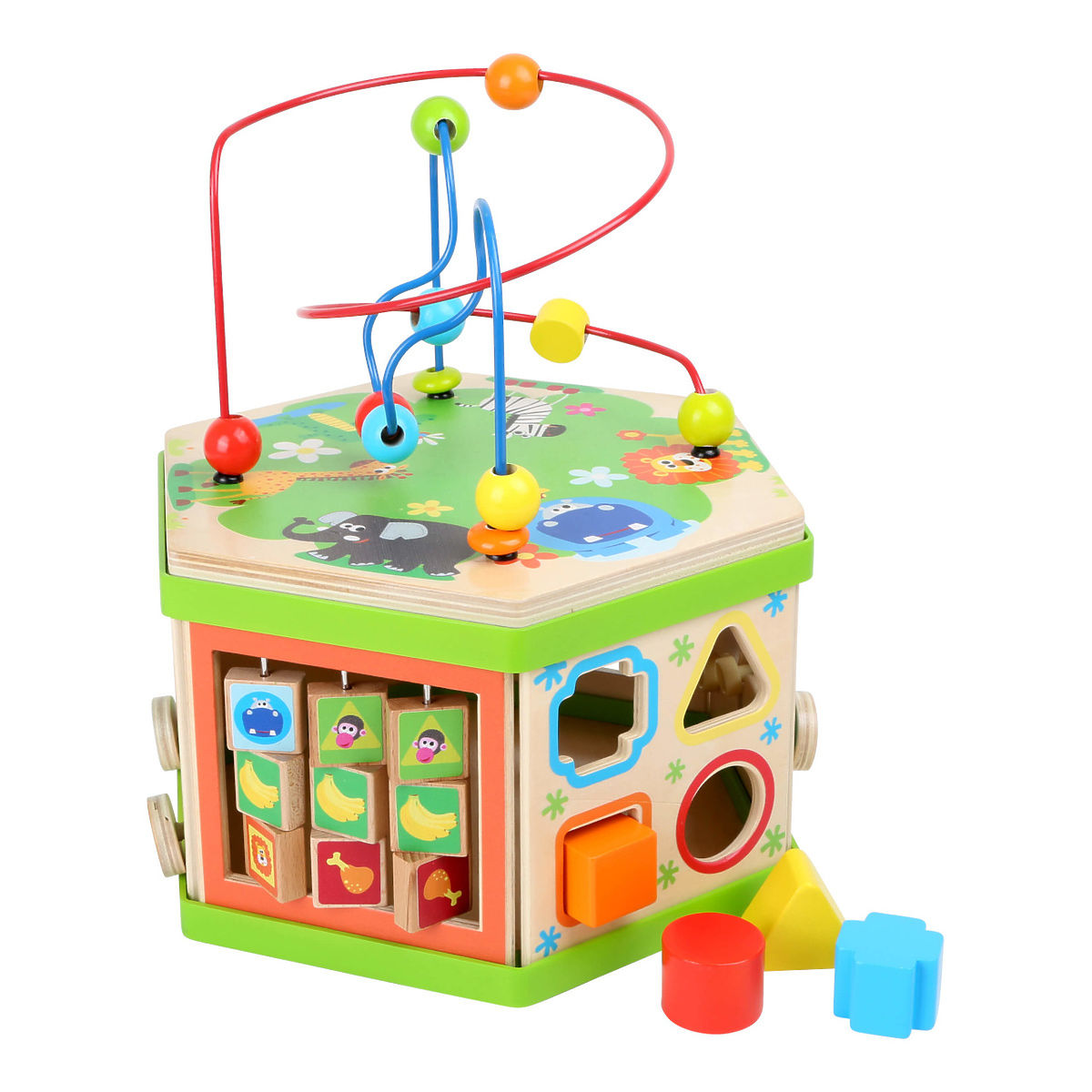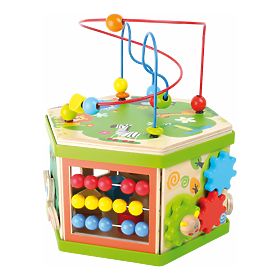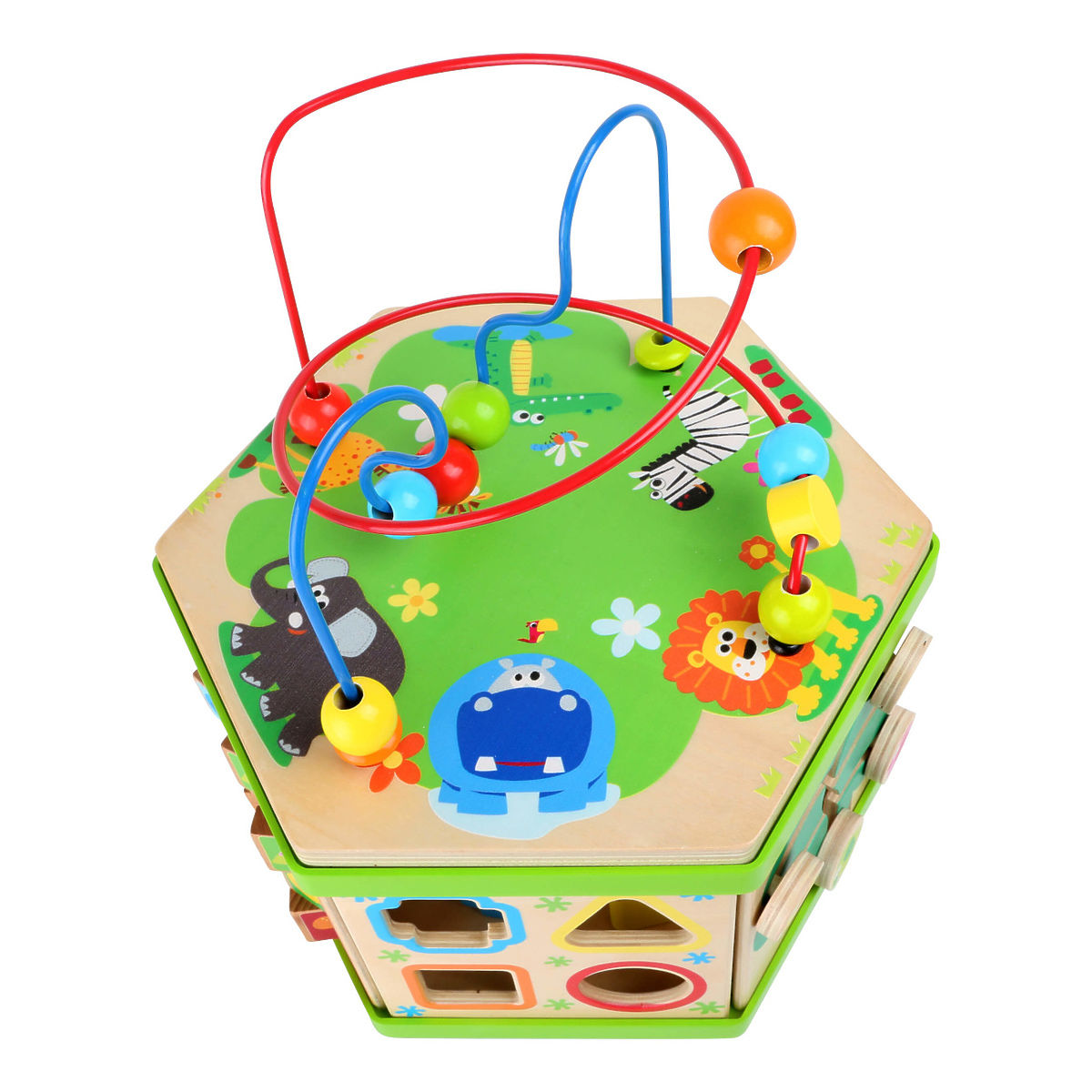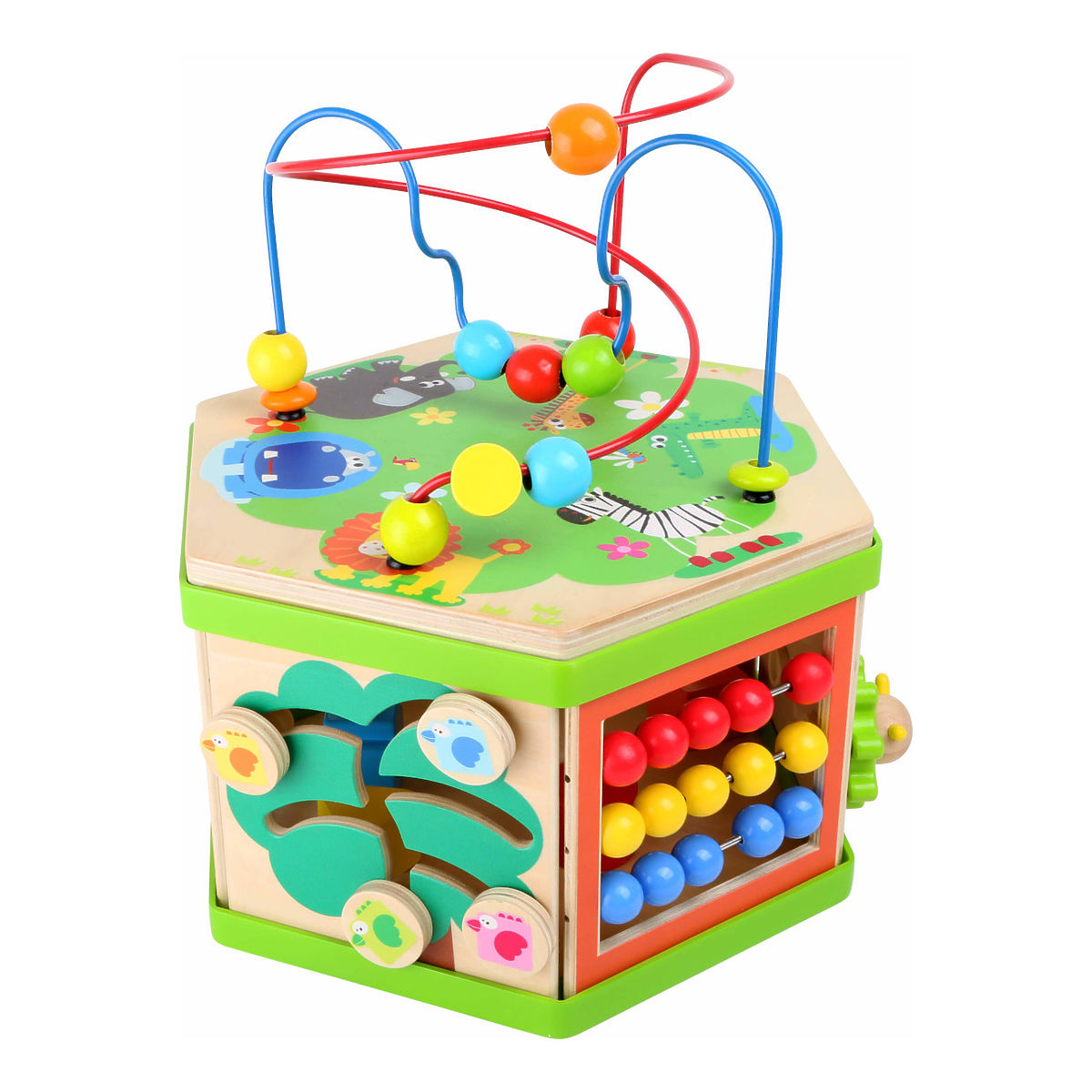 Multifunkčné aktivity motorická kocka v safari dizajne s horným labyrintom, ozubenými kolieskami, vkladaním tvarov a logickými hrami (cic-cak dráha, stromová .. viac