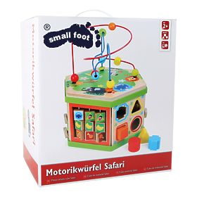 Multifunkčné aktivity motorická kocka v safari dizajne s horným labyrintom, ozubenými kolieskami, vkladaním tvarov a logickými hrami (cic-cak dráha, stromová dráha, počítadlo, otáčacie pexeso atď.) Deti hravo trénujú jemné motorické schopnosti a svoje sústredenie. Hlavné vlastnosti: rozvíja motoriku detí veselý farebný safari designmultifunkčné aktivity motorická kockarozvíja jemnú motoriku a sústredenie