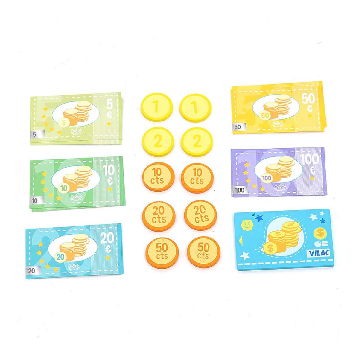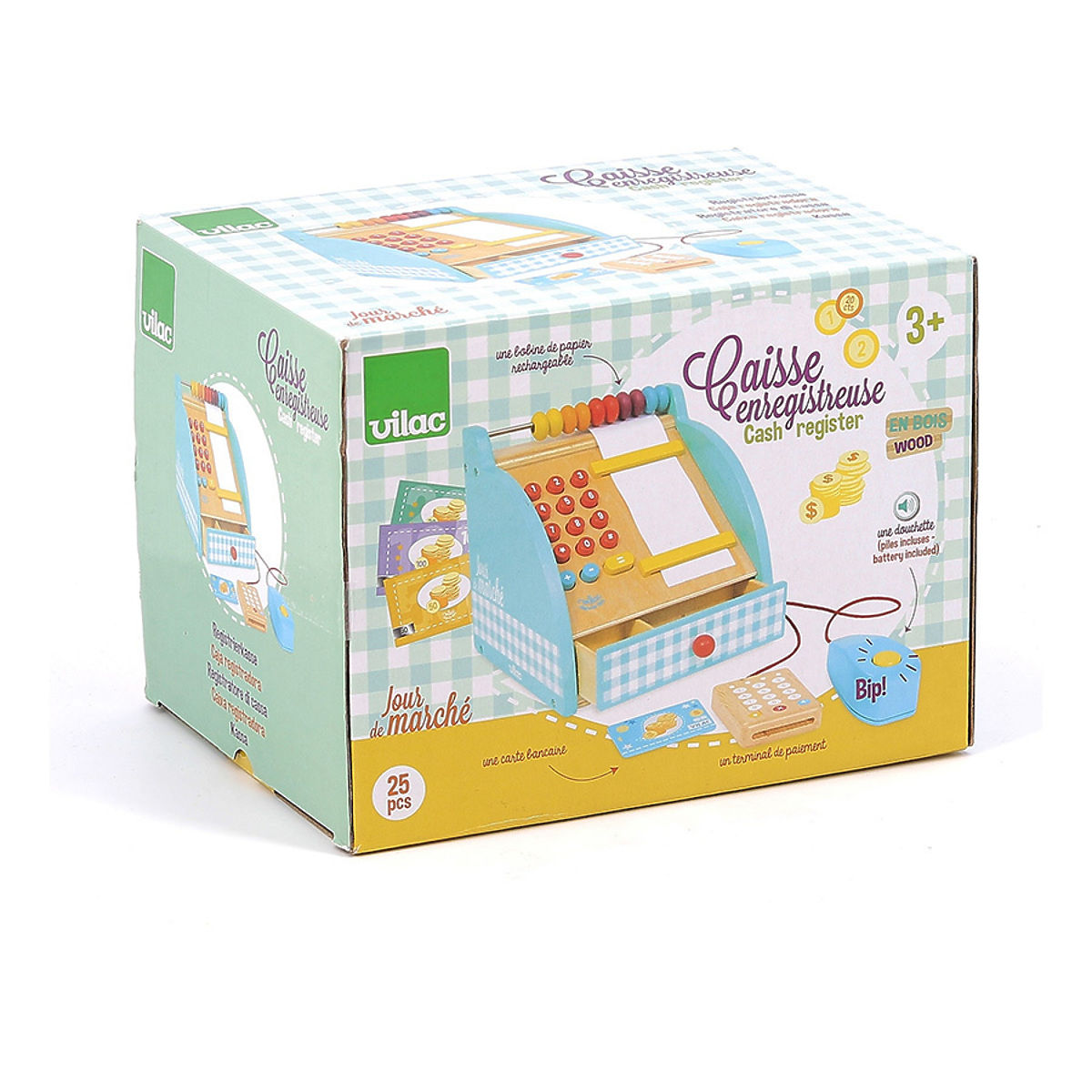 Drevená pokladňa so šuplíkom na peniaze, počítadlom a bankovým terminálom. Obsahuje aj klasické zvukové tlačidlo a funkčnú numerickú klávesnicu. Medzi doplnky patria bankovky a mince. Hlavné vlastnosti: rozvíja komunikačné zručnosti a sociálne interakciufunkčné prvky pokladne ako tlačidlá a šuplík na peniaze vrátane príslušenstva