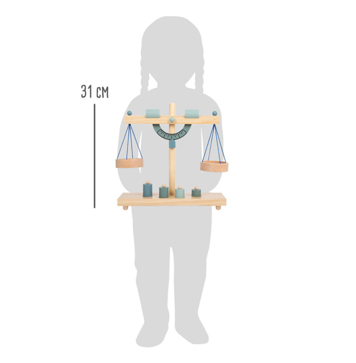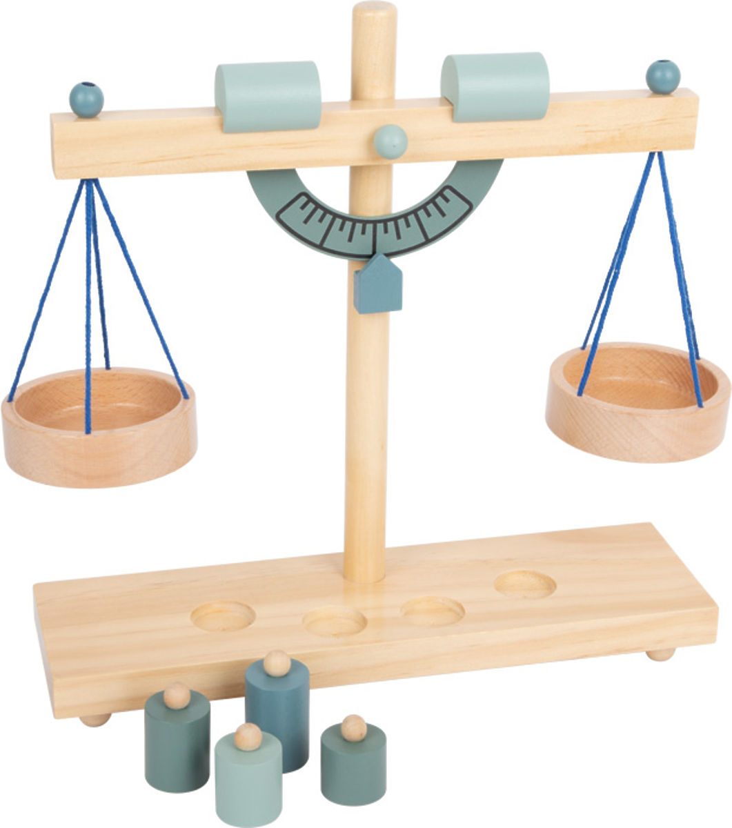 Važte jako na farmářském trhu! S touto stabilní dřevěnou miskovou váhou mají malí obchodníci po ruce správné vybavení, když váží zboží pro své zákazníky v obchodě s potravinami nebo v dětském stánku. Čtyři různé závaží pomáhají určit celkovou hmotnost a dvě posuvná protizávaží slouží k úpravě váhy. Děti hravou formou získají cit pro vážení a rovnováhu. Při obsluze zákazníků v obchodě s potravinami se procvičují sociální dovednosti a podporuje se aktivní hraní rolí. Tato hrací sada proto patří do každého obchodua stánku! Hlavní vlastnosti: Podporuje sociální dovednosti dětí4 závaží a protizávaží na ramenech pro vážení
