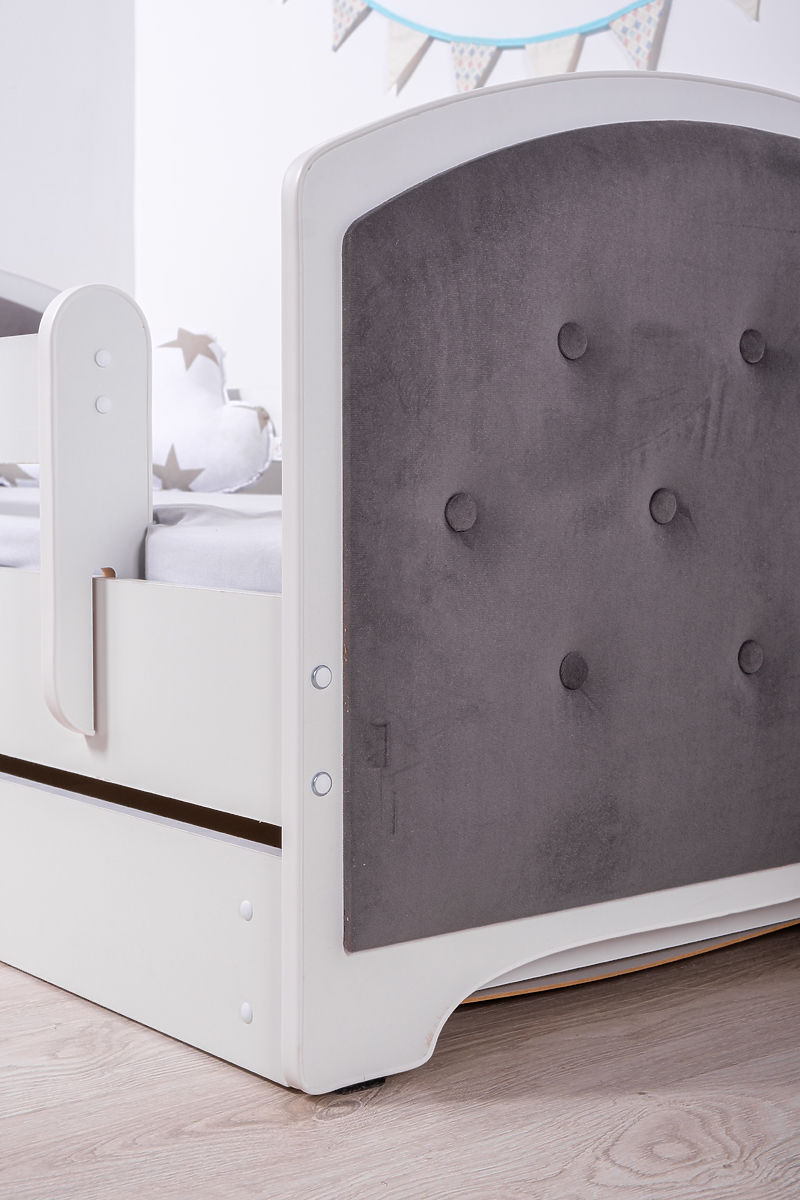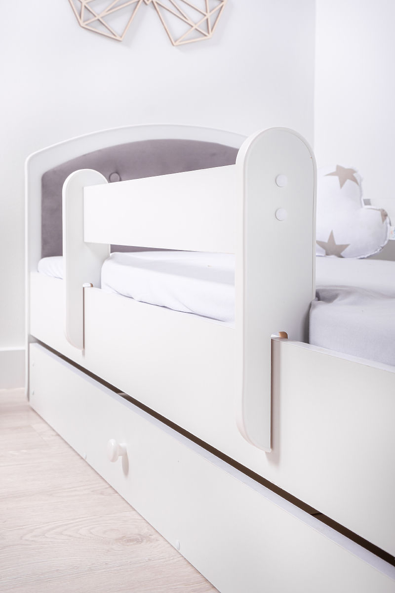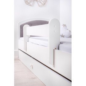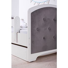 Čalúnená detská posteľ s tmavo sivými čelami. Súčasťou postele sú dve zábrany, úložný priestor a rošt z borovicového masívu.