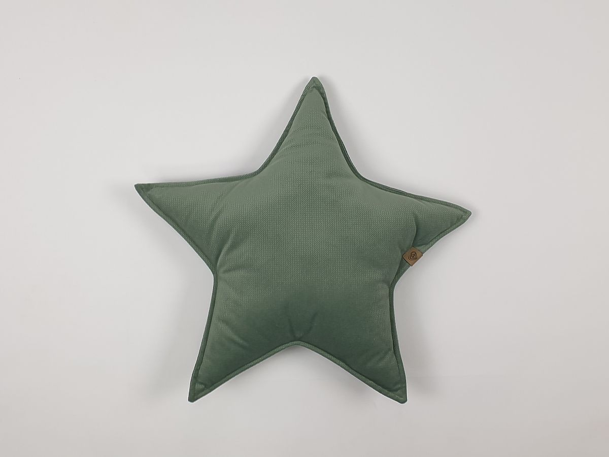 Obojstranný dekoračný zelený vankúšik v tvare hviezdičky z príjemného zamatu. Hodí sa do každej izbičky. Plnený silikónovou guličkou.