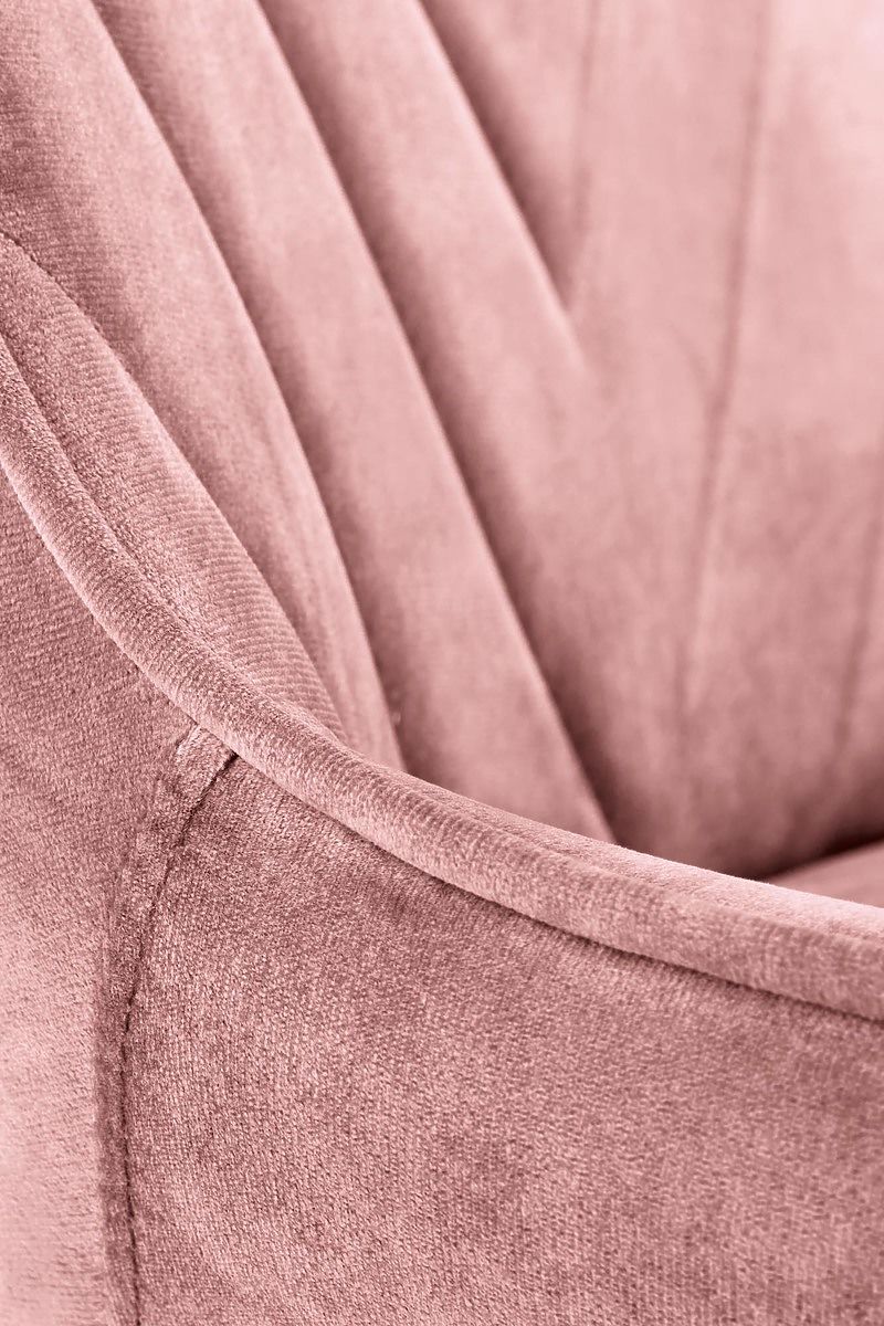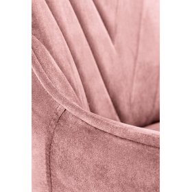 Sedák aj operadlo stoličky sú čalúnené na dotyk príjemnou, zamatovou látkou v ružovej farbe, ktorá je priečne prešívaná na operadle.