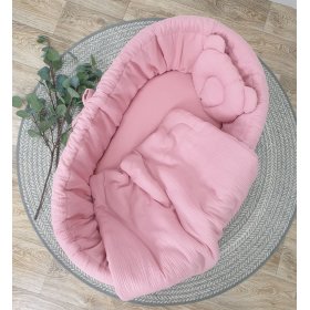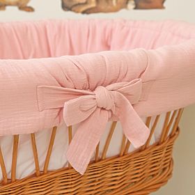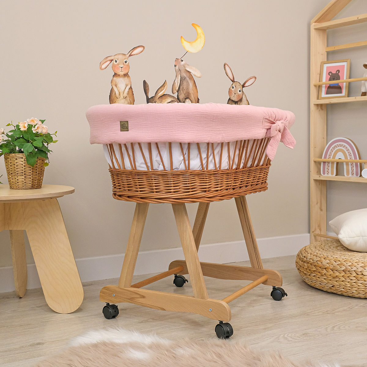 Tento prútený košík vytvorí dokonalé a útulné miesto na spanie pre vaše bábätko kdekoľvek v dome. Súčasťou košíka je 4-dielna sada obliečok s výplňou z mušelínu, plnená antialergickým silikónovým rúnom. Vzdušné a na dotyk mäkké mušelínové obliečky minimalizujú možnosť prehriatia a zabezpečujú dostatočnú cirkuláciu vzduchu. Vankúš je zdobený ušami, má prehĺbenie na hlavičku vášho bábätka. Textílie sú jemné na dotyk.