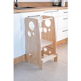 Detská montessori učiaca veža v hnedom prevedení s kruhovými výrezmi a bielymi schodíkmi. Je spoľahlivý a praktický pomocník, ktorý rozvíja kreativitu, .. viac
