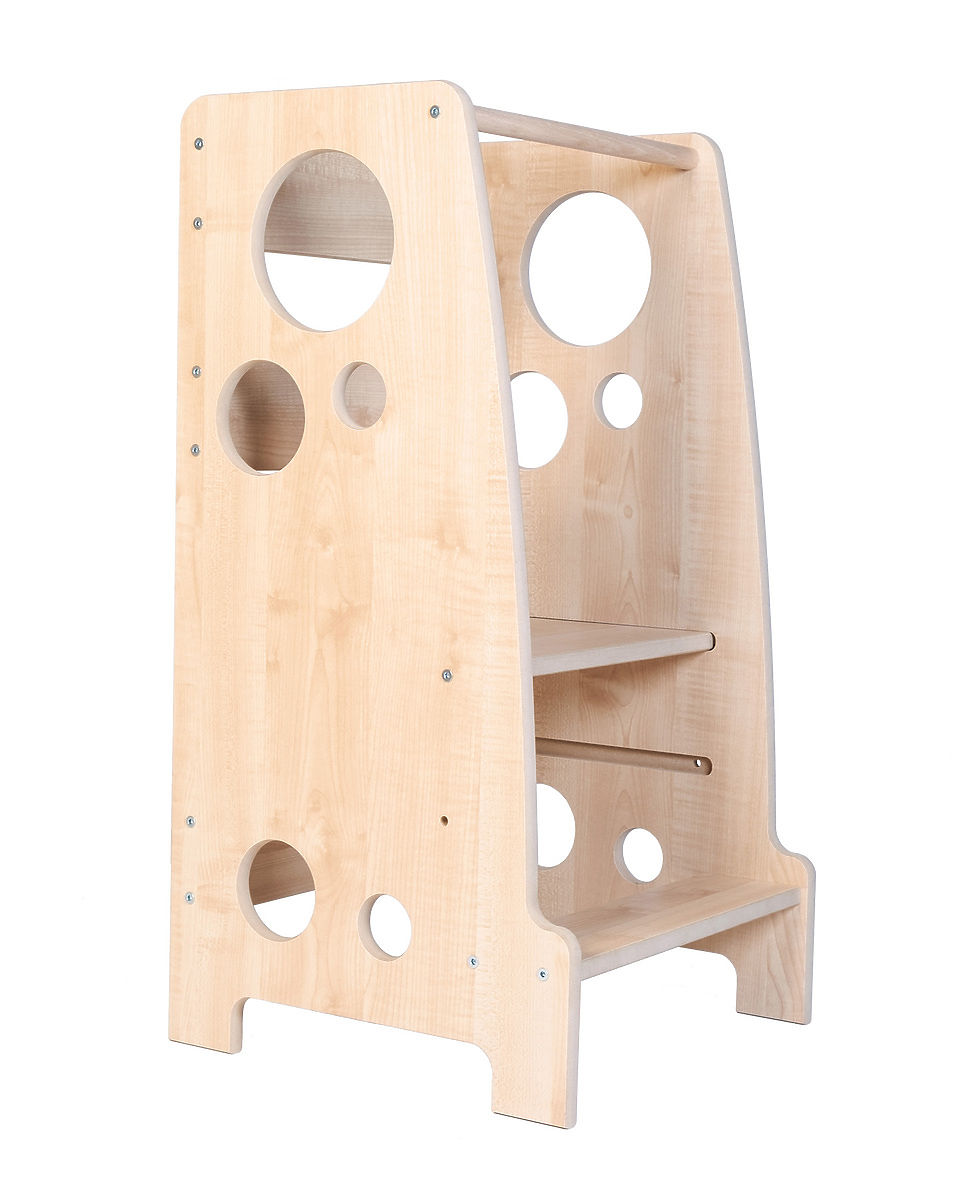 Detská montessori učiaca veža v hnedom prevedení s kruhovými výrezmi. Je spoľahlivý a praktický pomocník, ktorý rozvíja kreativitu, motorické schopnosti a taktiež má pozitívny vplyv na celkový rozvoj a socializáciu dieťaťa.