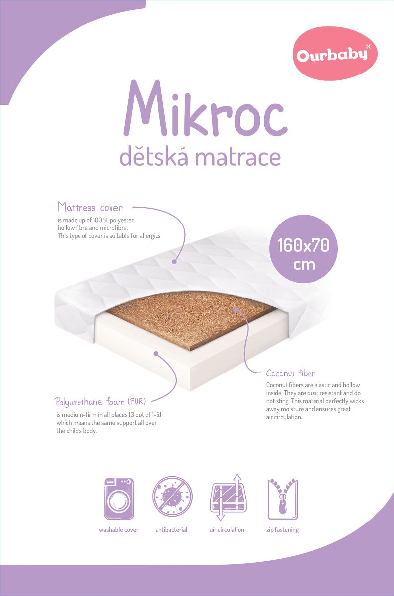 Detský matrac MikroC s rozmerom 70x160 cm patrí k obojstranným matracom, ktoré deťom dávajú možnosť voľby medzi mäkšou a tvrdšou stranou. Mäkkšia strana je z PUR peny a tvrdšiu stranu tvorí doska z kokosových vlákien. Matrac ocenia ako predškoláci, tak staršie deti.