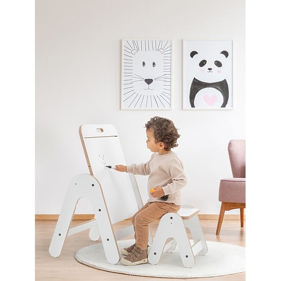 Praktický stolček so stoličkou, ktorý sa v okamihu premení na kresliacu tabuľu. Stôl disponuje aj drevenou tyčou na rolku papiera, ktorá je uchytená v nožičkách stola. Vaše dieťa tak smelo môže vytvárať kreatívne kresby.