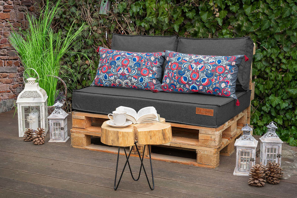 Tmavosivá sada polstrov na paletový nábytok je skvelou voľbou ako jednoducho vylepšiť sedenie na terase, balkóne alebo na záhrade. Ideálne pripravené na rozmery europalety. Špeciálna technológia šitia zaisťuje odolnosť proti UV žiareniu a vodeodolnosť materiálu, vďaka čomu materiál zostáva pevný a nevybledne.