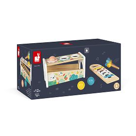 Dve hry v jednom – kladivom so včeličkou zatĺkame 3 drevené farebné guličky a tie vydávajú krásny zvonivý zvuk na klávesoch xylofónu.