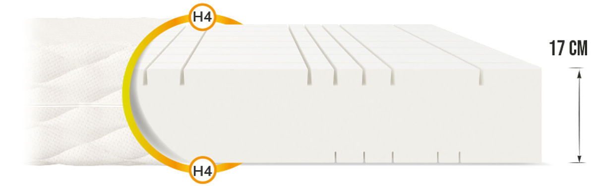 GOYA je univerzálny penový matrac s výškou 17 cm , ktorý dopraje kvalitný spánok celej rodine. Jej konštrukcia je jednoduchá, pretože bola vyrezaná z jedného kusu peny, a napriek tomu má mnoho výhod. Obojstranný matrac je rozdelený do 7 zón vďaka radu pozdĺžnych a priečnych rezov. To vedie k výraznému zvýšeniu plasticity, ktorá poskytuje skvelú oporu chrbtice a preto sa budete prebúdzať svieži a plní energie.