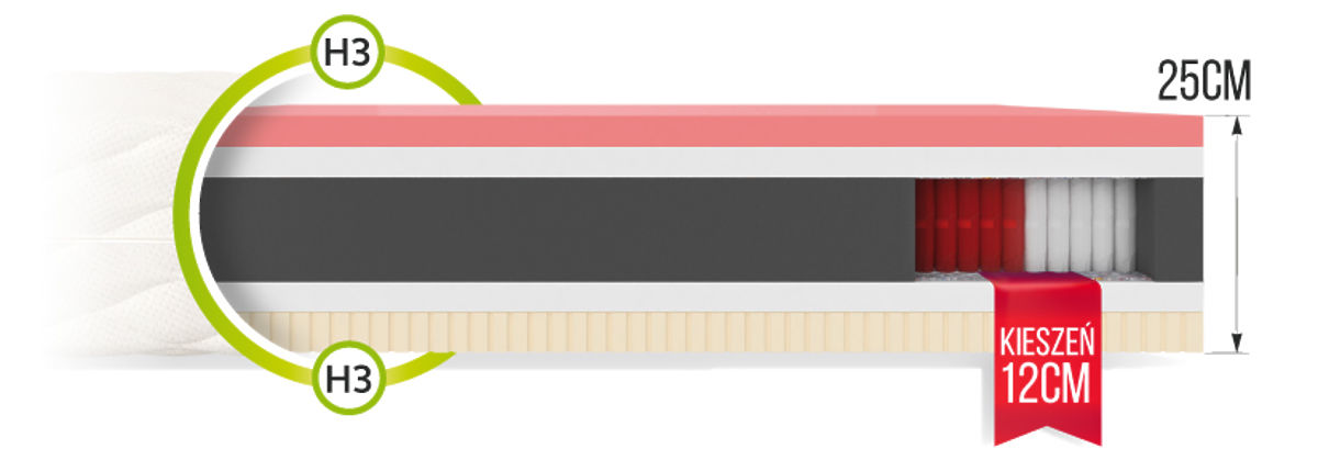 Na jednej strane matraca sa nachádza vrstva latexu , ktorá je veľmi pružná , čo zlepšuje pohodlie, a vďaka perforovanej štruktúre je skvele priedušná . Ďalšiu vrstvu tvorí pur pena T25 , ktorej prednosťou je vysoká odolnosť proti deformácii, pružnosť, priedušnosť a stabilizuje telo počas odpočinku. Medzi pružiny a pur penu T25 bol vložený oddeľujúci materiál . Jedná sa o prírodnú plsť, ktorá môže výrazne predĺžiť životnosť matraca a posilniť jeho konštrukciu. Komfort spánku neuveriteľne zvyšuje termoplastická pena VISCO , ktorú nájdeme na druhej strane matraca. Vplyvom telesnej teploty a hmotnosti dokonale kopíruje prirodzené krivky tela , čo zaisťuje správnu podporu celej postavy. VISCO a pružiny opäť rozdeľuje vrstva odolnej pur peny T25 a prírodný oddeľujúci materiál.