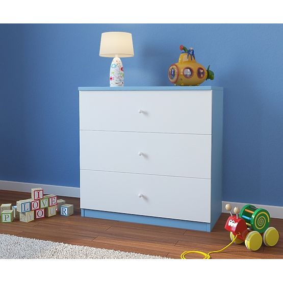 Komoda Ourbaby v bielo-modrom prevedení, ktorá rozžiari každý izbičku. Spolu s nočným stolíkom a posteľou vytvoria krásny nábytkový set. Komoda je vyrobená z kvalitnej lamino dosky.