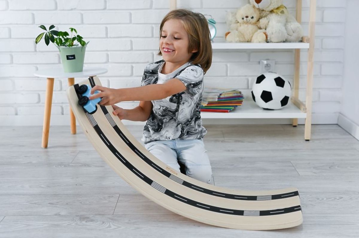 Babynabytek.sk » Montessori / Montessori hračky a pomôcky / Drevená balančná doska s autíčkom a cestou